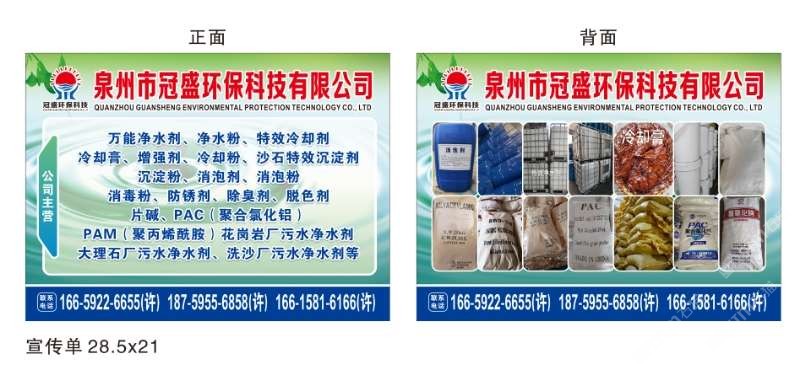 發(fā)布信息: 冠盛環(huán)??萍?6615816166 主營(yíng)產(chǎn)品:凈水劑,冷卻劑,冷卻粉,大理石人造石專(zhuān)用凈水劑,沉淀粉,消泡劑,消毒凈水劑,防銹凈水劑,除銹劑,除臭劑,聚丙烯酰胺,聚合氯化鋁,鹵精,洗沙專(zhuān)用凈水劑,壓濾機(jī)專(zhuān)用凈水劑,陶瓷廠(chǎng)專(zhuān)用凈水劑(黃藥 白藥)等所有水處理環(huán)保材料……