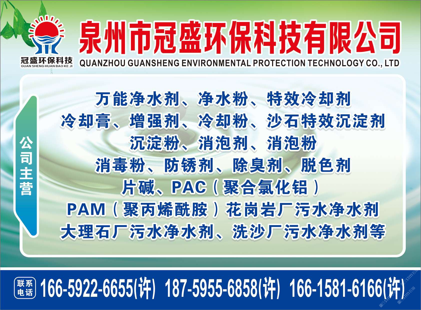 發(fā)布信息: 冠盛環(huán)保科技18759556858 主營(yíng)產(chǎn)品:凈水劑,冷卻劑,冷卻粉,大理石人造石專用凈水劑,沉淀粉,消泡劑,消毒凈水劑,防銹凈水劑,除銹劑,除臭劑,聚丙烯酰胺,聚合氯化鋁,鹵精,洗沙專用凈水劑,壓濾機(jī)專用凈水劑,陶瓷廠專用凈水劑(黃藥 白藥)等所有水處理環(huán)保材料……